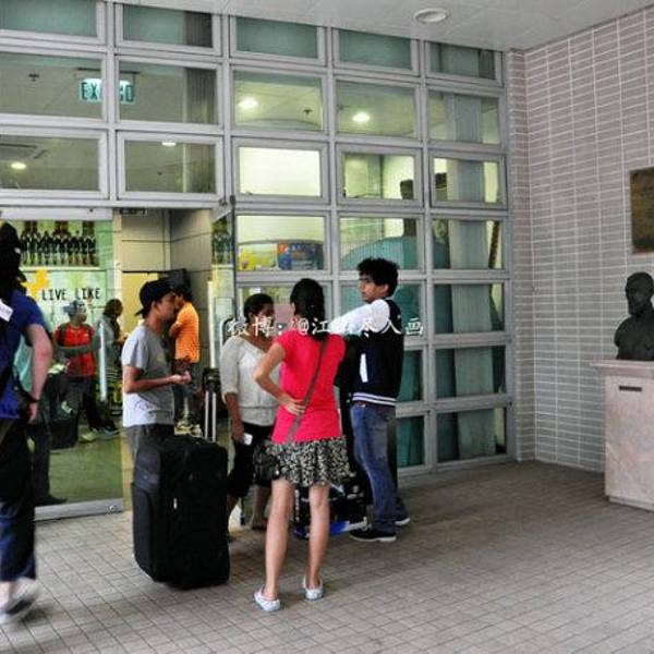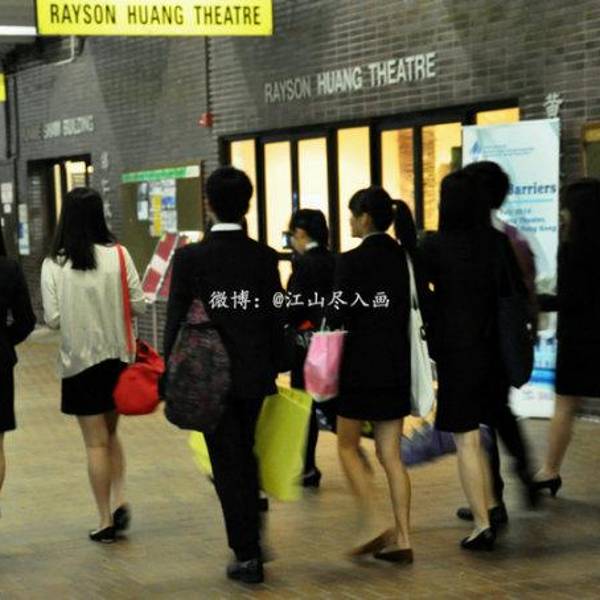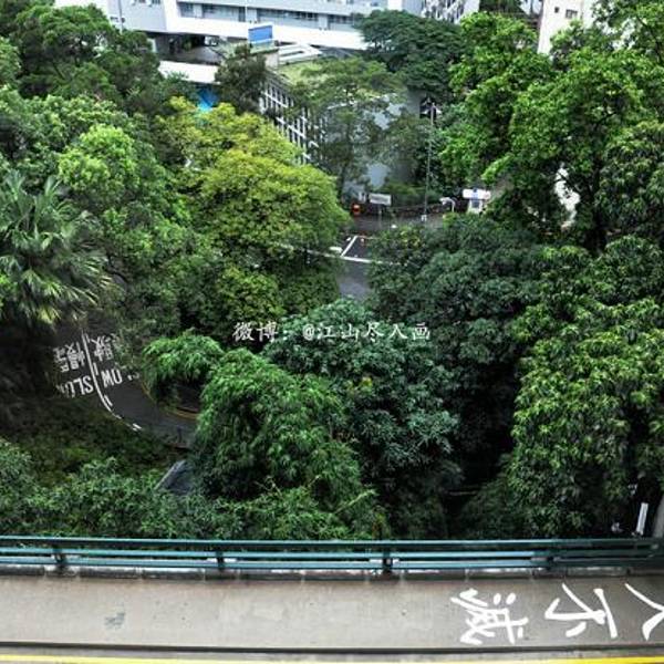 “民主星火”更是连人行道也不放过。校园内防止滑坡的山体工程,依山而筑的港大,错落有致,环境清幽,绿意盎然。漫步港大,也颇有山野情趣。花园荷塘,林木虬枝下小坐,也是感受校园的绝佳方式。rayson huang theatre 门前,或许是一群港大的青年才俊。学生宿舍楼前,各种肤色的学生。港大的很多楼内,都有咖啡店,速食店入驻。