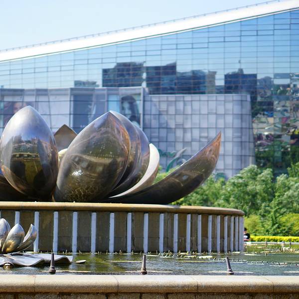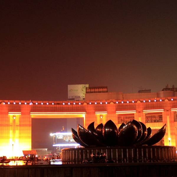 泉城广场位于山东省会济南,毗邻护城河,西连趵突泉、五龙潭公园,东接黑虎泉,距离北边的大明湖不过1公里,地理位置可以说相当好,小伙伴们出游的会合地点往往选在这里。泉城广场周边的大型购物商场、饭店也很多,可以说来这既能旅游,也能购物,还能吃美食。泉城是济南的别名,整个广场的设计紧扣“泉”这一主题,南北两侧是狭长的绿化带,正中间坐落着泉标,蓝色高耸的钢制雕塑和中间的铁珠构成了篆书“泉”字的造型,你可以合影留念。东端的山东省科技馆适合带小孩的游客一游,孩子在里面能学到很多科普知识。广场上常能看见在此休闲娱乐的当地市民,喂鸽子、放风筝、溜旱冰,到了傍晚市民更多,愈发热闹。泉城广场东部的荷花音乐喷泉中间是荷花雕像,绕着荷花的喷泉会变幻不同的造型,每场喷泉约30分钟。晚上的喷泉特别好看,灯光不停变幻,适合拍夜景,夏夜又是纳凉的好去处。喷泉东部圆弧形的文化长廊可以登顶,有很好的视野,能拍摄喷泉和泉城广场的全景。沿着北边紧贴广场的护城河散散步也是不错的选择,东端还有泉城广场游船站,可以坐游船欣赏护城河风光。护城河游船共设10站:黑虎泉站、泉城广场站、趵突泉站、五龙潭站、大明湖西南门站、大明湖稼轩祠站、司家码头站、超然楼站、知春桥站、青龙桥站,每人每站次10元,全程100元。泉城广场地下有银座购物广场,有麦当劳、85度C、nike、adidas等等,入口就在蓝色泉标的东侧。若往北走200多米到与广场平行的泉城路上,街两侧有贵和商厦、恒隆广场、泰府广场等大商场。泉城路的岔路芙蓉街上则是琳琅满目的美食店,无论想吃小吃还是正餐,都能在这得到满足。