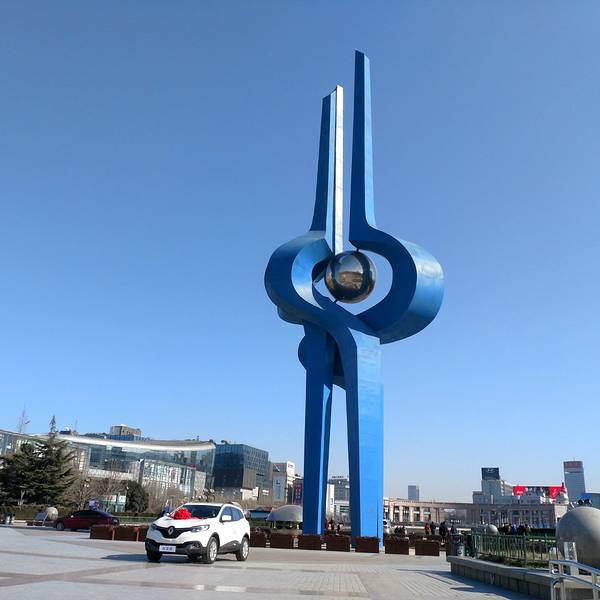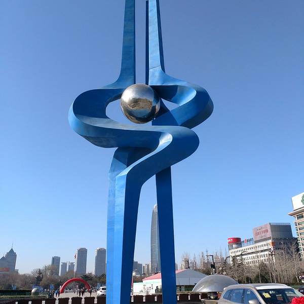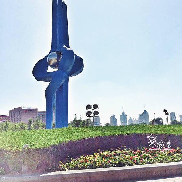 泉城广场面积比较大,主建筑是像两根蓝色的戟一样的东西,中间有个圆圈包裹着一个银色的亮球,整个的建筑可能要表达的意思是泉水想这两根蓝色的柱子一样一直喷涌而出没有尽头把,银色的球体可能是代表水源和水滴。