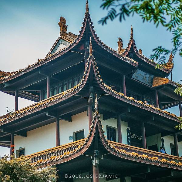 江阁正面:利用广角镜头拍摄建筑全景,傍晚蓝调时刻最佳。
