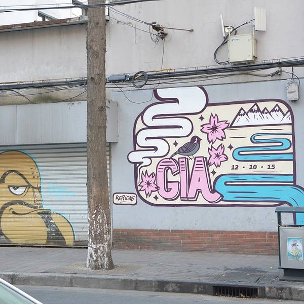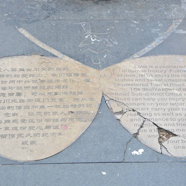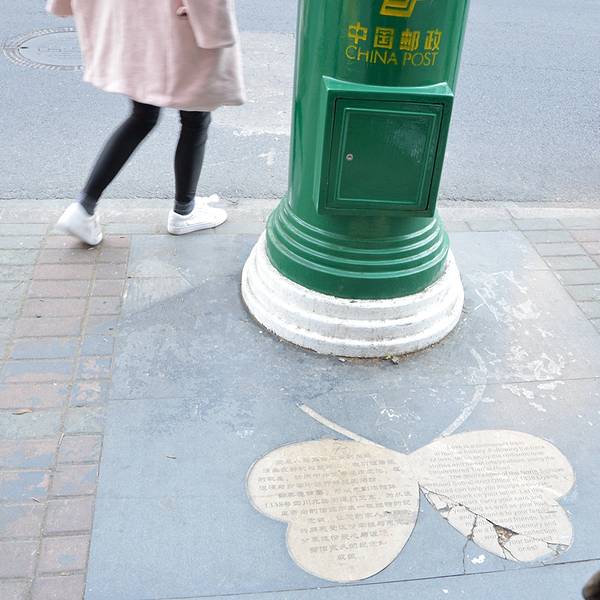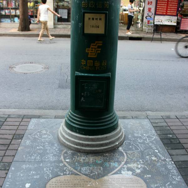 到了甜爱路就能看到它的路牌,其实甜爱路的特色就是在路口设有一只特别的爱心邮筒,但是一定要注意的是要向从这里投出的信函,上盖上一枚英文爱的邮戳,一定要自己步行到离甜爱路邮筒不远的溧阳路1338号四川北路街道门卫室去盖爱心邮戳,不然只是将信塞进邮筒里,是没有这个邮戳的哦。邮筒所在的那块地砖上面早已经被写满了爱人之间的名字和祝福,密密麻麻的。而且我更建议提前写好信件或者明信片,提前贴好邮票。因为这附近就只有一家便利店,借个胶棒都很麻烦,所以还是提前搞好,直接来盖好邮戳然后塞进邮筒是最好的。