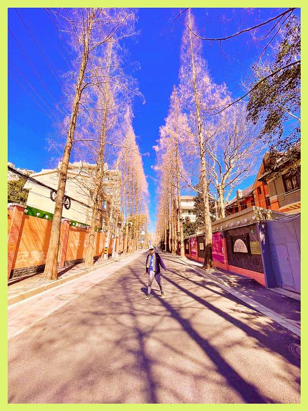 一条长街两边笔直站了两排的水杉,路旁很多充满年代感的美丽老洋房,整个路面车辆不多,环境清幽,宁静而祥和,温柔而充满故事感。