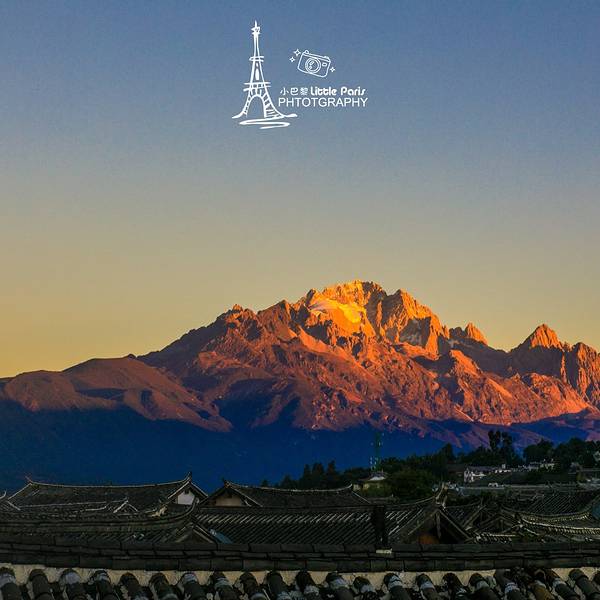 在【听花堂客栈】的屋顶,看到了清晨的古城和日照玉龙雪山。