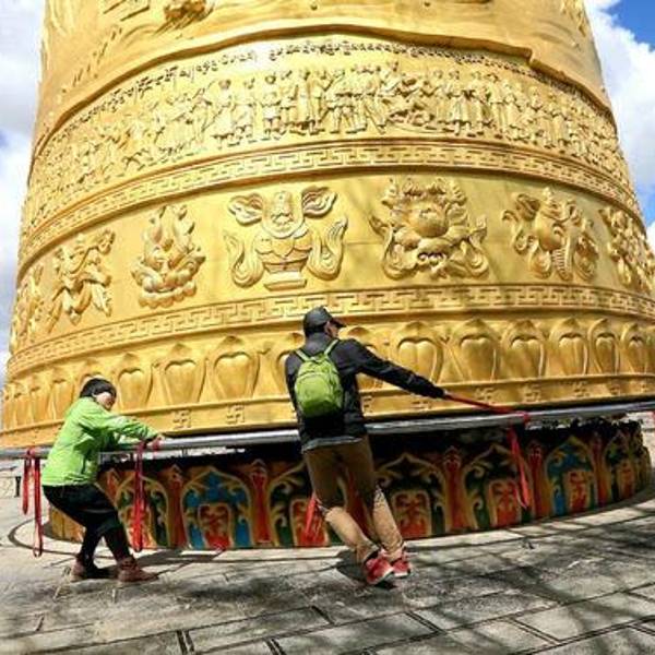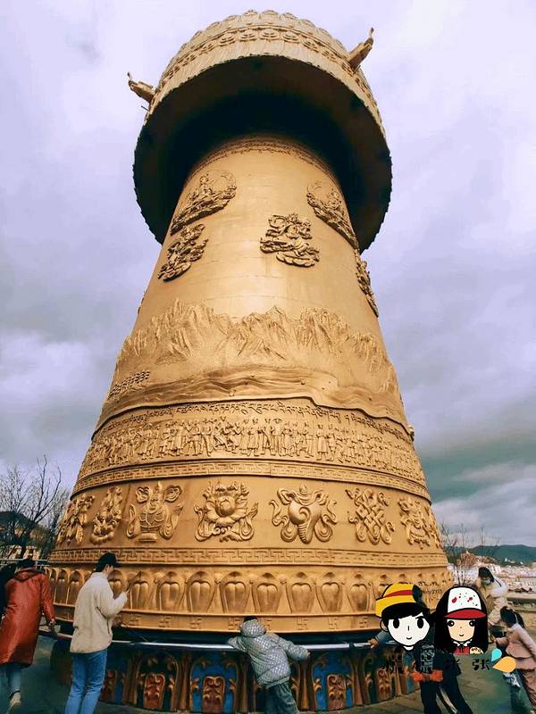 半路上的阶梯上还有卖酥油茶的阿姨们,爬累了,一块钱来一碗。大概有5层楼那么高要想转动如此巨大之经筒需众人同时着力,每顺转一周,相当于默念佛号124万声,转满三周,就可以消灾祈福,吉祥如意。 展开