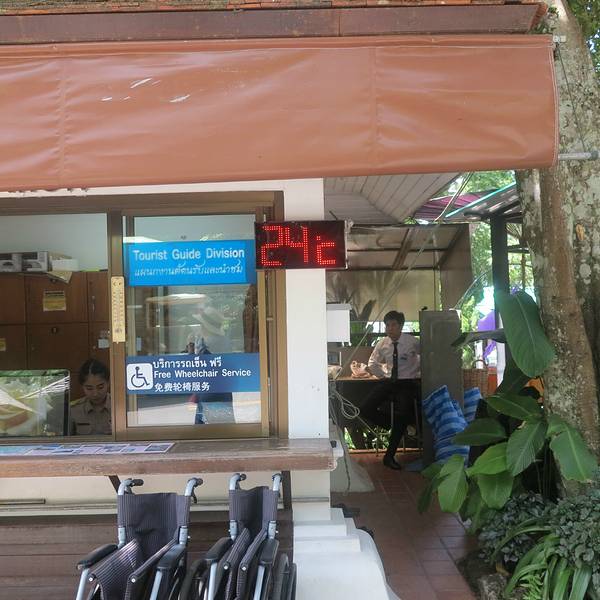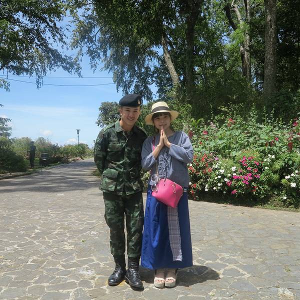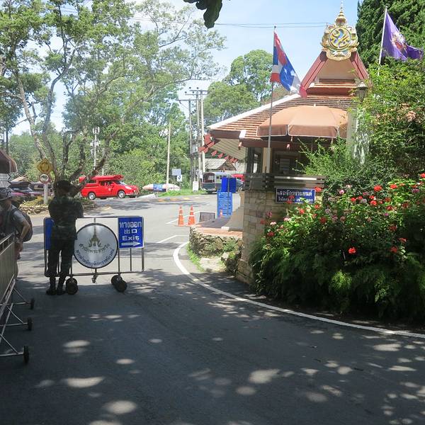 一般司机都会直接先带我们去蒲萍行宫,既然行宫,也就是说,这里只是最热的时候,泰国皇室回来避暑小住的。只有在皇室不在这里的时候,才会开放的哦,而且即便是开放也是只能在花园和大道上走走看看,是不可以接近任何一个宫室的。门票50泰铢!这里的着装会检查的非常的严格的。希望大家能提前有个准备,不然试想一下穿着自己的衣服,再花钱租一套衣服罩上,那酸爽,你有个心理准备吧!看到了吗,这是入门的地方,有皇宫守卫逐一检查着装的。不要抱有侥幸心理。当山下35度左右气温的时候,这里居然只有24度,这里可以免费借用轮椅哦,很人性化的服务哦!蒲萍皇宫的各种奇花异草都是这么炫彩夺目,美好的让人怀疑这是塑料的仿真花了。因为隔得花花太近了,引来两个皇宫护卫来,不过人家只是微笑着看了看我,确认我们没有踩到花花,距离花花还是一个安全距离的时候,微笑走开,不过邀请他们合个影的话,他们还是很乐意的配合的!那边的建筑就是皇室的住宅区了,门口的花园外面都是有守卫了,是不准靠近的。在热带雨林区里面不时能看到这些小小的岗亭,幻想一下,自己就是皇室的某个小公举,然后漫步在花园里,好吧我想多了!海拔1200米的高度,可以模糊的看到清迈城的样子。可惜太远,只能是个模糊的!一个小小的蓄水池,在我们去的时候,完全干了,所以也就不跟大家呈现了!