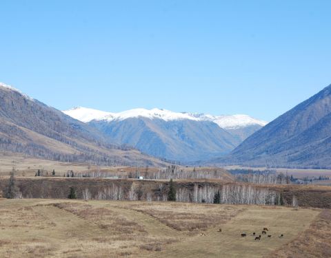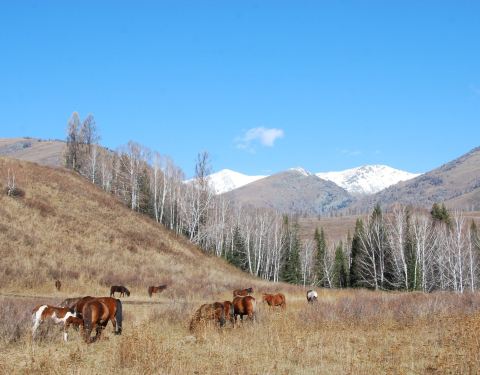 禾木草原位于布尔津县山间断陷盆地中,这里河流穿梭,禾木河把整个大草原割为两半禾木草原位于布尔津县山间断陷盆地中,这里河流穿梭,禾木河把整个大草原割为两半。这里一面森林茂密,植被丰富。而在阴坡却是繁花似锦,牛羊满山。