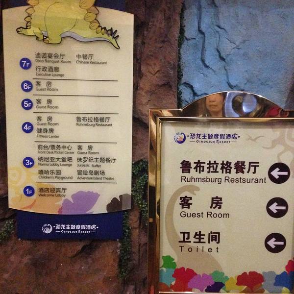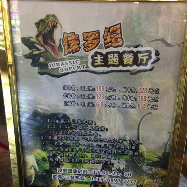 没有订到环球恐龙城恐龙主题度假酒店:他的位置就在迪诺水镇内,距离恐龙城的新大门只有几百米远,非常方便。最最重要的是,酒店内部装饰都围绕着恐龙元素,会让小恐龙迷们兴奋不已。此行由于主题酒店太火爆了,如果要定此酒店一定要出行前半个月订购哟!所以去体验了一下酒店的自助晚餐。价目表下图中有拍摄。酒店自助品种比较多,进入酒店随处可见有趣的恐龙环境,非常适合带孩子去玩耍。