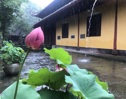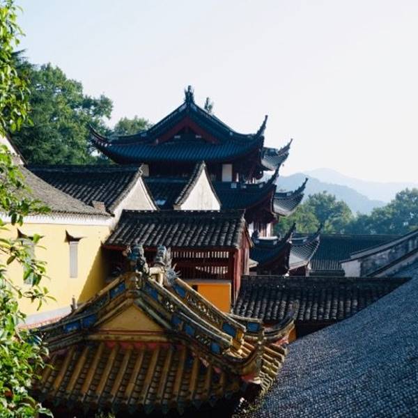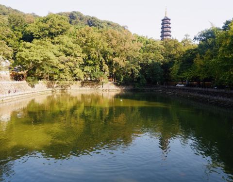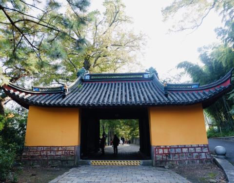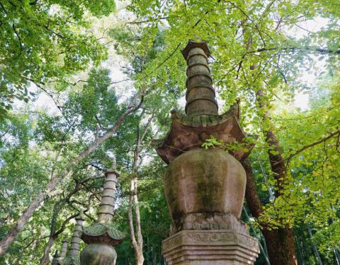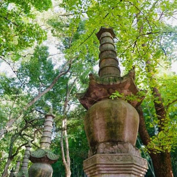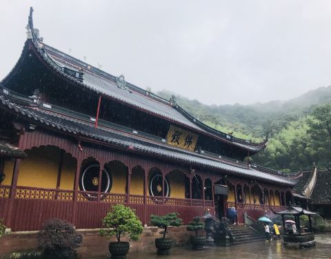 天童寺距离宁波26公里的太白山麓,其历史可以追溯到晋朝,是宁波有名的千年古刹之一。来这的游人香客不多,寺里时常能看到僧人在散步或打坐。即使你没有佛教信仰,来感受宗教氛围,呼吸新鲜空气也是不错的体验。和其它寺院不同的是,天童寺有三道山门,沿着林荫小道上山,会依次经过伏虎亭、古山门和景倩亭,路上远远就能看见山上的万佛塔。因为寺院就在天童国家森林公园旁边,一路上的景色非常好,满眼都是绿色。再往前,走过走七塔苑的七座石塔,就到了万工池,这里的两个池子原来是放生池,如今一个池子里还有不少放生的小乌龟。万工池对面的照壁上写着“东南佛国”四字,周围的树木和寺院的建筑倒映在池水中非常好看,引得不少游人在这儿拍照。旁边的广场上有许多鸽子,哄抢着游人丢的饲料。进入寺院顺着山势往上走,中轴线上的主建筑依次是佛殿、法堂(藏经楼)、罗汉堂,宏大的建筑群之间以长廊相连接,因此进入寺庙便能“晴天不晒太阳,雨天不走湿路”。如今寺中较古老的建筑是明朝重修的佛殿和方丈殿,古朴庄严。西侧法堂内供奉着顺治皇帝所赐的鎏金药师铜像,东禅堂现为藏品陈列室,展出一些佛教文物。不容错过的是北侧的罗汉堂,里面的罗汉石雕非常精美,人物神态自然老成,颇有神韵。爬到较高处的应真亭,在这里俯瞰寺院全貌和四周的山景,视野十分开阔。亭子周围还有许多纪念碑,多为日本佛教团体和佛教人士所立,许多香客和游客在这里休息、赏景、拍照。下山回到“东南佛国”照壁,从照壁旁边的小路往左走,不远就是千佛塔,塔附近有一个提示牌写着“古天童”。顺着路走过一段比较冷清的小道,便能来到竹林深处的古天童。比较常规的行程是,上午游玩天童寺后,中午稍事休息,下午继续前往天童国家森林公园爬山,而后乘车返回宁波市区。