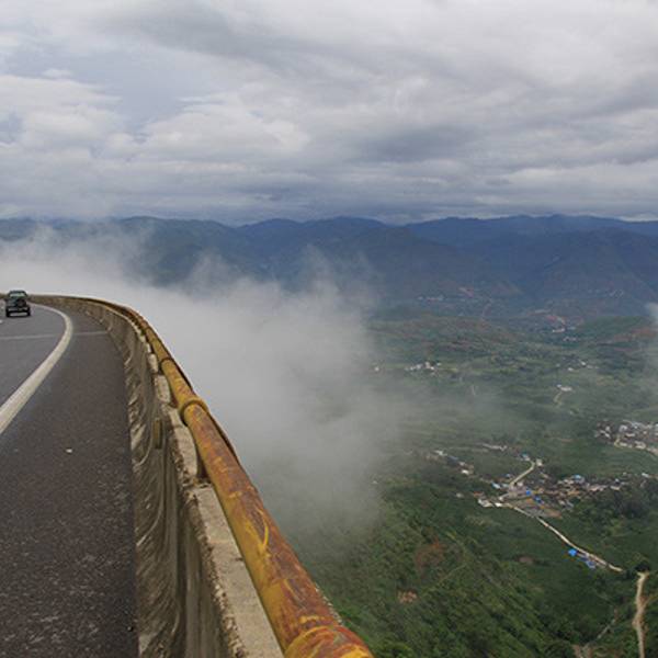 路好像架在天上一般,云直接飘过路面。进入杭瑞高速,再次翻越高黎贡山进入杭瑞高速,再次翻越高黎贡山。高速公路在大山间架桥挖洞,每一次在这里都能遇到云雾,这次看到忍不住靠边临时停下来捏几张