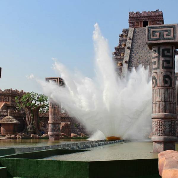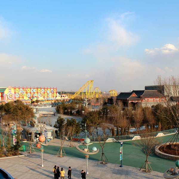 没想到我就这样灰溜溜的成为整个队伍的累赘了,这是我意料之外的事情。看着被碰肿的膝盖,真不知道一时心血来潮的冲动是为了什么。30十分钟不到,眼前有一座看上去很酷的公园出现了,方特欢乐世界主题公园,稀疏的人群里零落点缀一望无际的白雪地,我们小分队来了。这是一家以高科技主打、以中国神话为背景的文化科技主题公园,属于第4代主题公园,其实我不懂这几代怎么分的。嘿嘿……