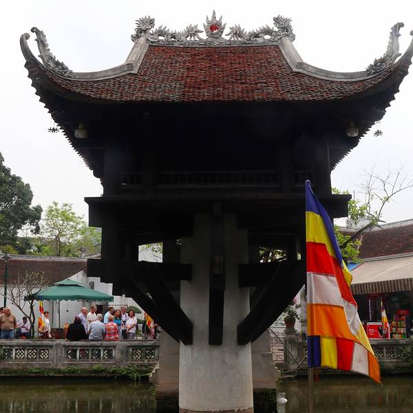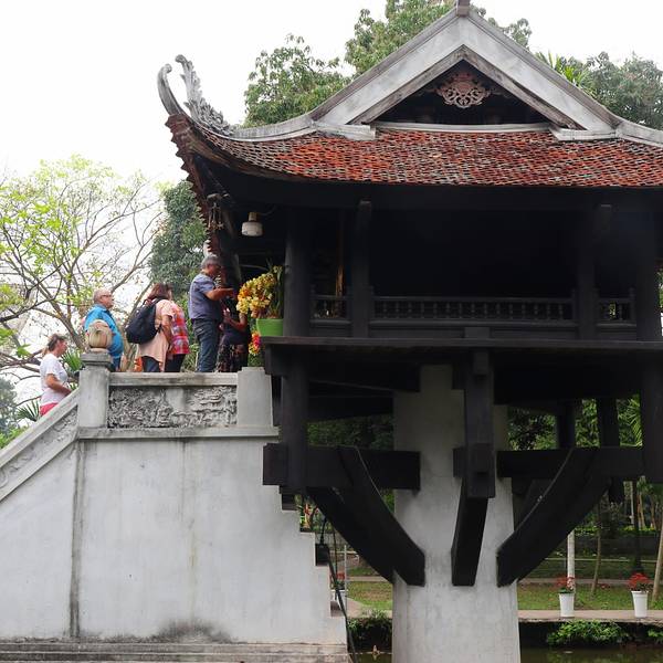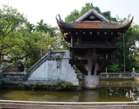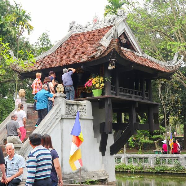 独柱寺的正式名称是延祐寺,也叫莲花台,位于巴亭广场的西南边。这座寺庙很小,却很出名,其独特之处在于它立在莲花池中心的一根柱子上,意寓着从苦海中绽放出一朵纯洁的莲花。 独柱寺的造型十分优美,高4米的石柱象征花梗,寺身及四边微翘的屋檐构成花瓣,其正面檐下挂着“莲花台”匾额。据说独柱寺很灵验,来此烧香许愿的当地人络绎不绝,甚至连当年的胡志明也常来进香。 通过一道楼梯可以上到寺庙门口,但不能入内,你也不妨入乡随俗烧香拜佛一番。不过,由于空间有限,游客常常需要排队才能上去。 由于几经修缮,现存寺的规模比原先的要小一些,但是造型和风格依然留存。