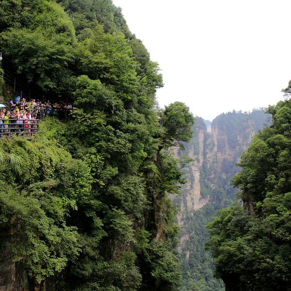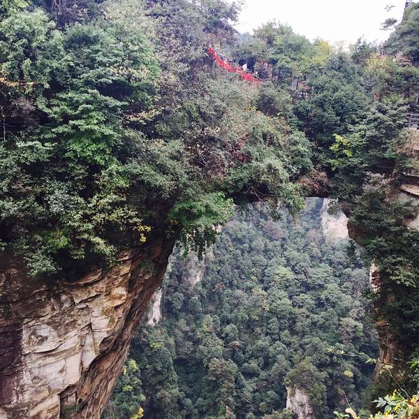 周围还做了《阿凡达》男女主角的雕塑和它们的飞骑,很多人站在大鸟上拍照,但是我觉得不是很好看我就没拍4.其实在这个铁桥的左手边是非常适合观赏乾坤柱的,不过这个桥上人很多,所以只能拍拍照片就赶快走开。不能影响别的人拍照。十一更是人满为患,突出了乾坤柱的火爆。下面是在桥上视角看到的乾坤柱
