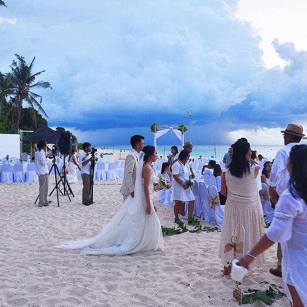 第一次我们从白沙滩到普卡沙滩,乘坐的摩托突突,大概要15分钟-20分钟,还是挺远的,刚好赶上了日落。特别巧的是,往人少的深处走,刚好有一对新人在办沙滩婚礼,算是第一次近距离“参加”沙滩婚礼了。参加婚礼的所有人都穿的白色礼服,挺西式的。梁静茹的婚礼也是在长滩岛办的,但据说是在S1那里。