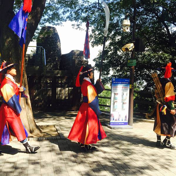 【南山公园之八角亭地区游览】八角亭地区位于南山顶上,主要有四大必体验:第一、N首尔塔,韩国标志性建筑,尤其是《来自星星的你》热播后,火遍全球,既可以在周围壮观的爱情锁,也可以花9000韩币买张观光票登高望远;第二、八角亭,古色古香可供游人休息,在八角亭广场每天下午三点到四点会有民俗表演和传统武艺示范,周一休息;第三,烽燧台,不知为什么走到此地时,我就想到了周幽王为博美人一笑烽火戏诸候的史事,这里每天上午11:00至12:30有巡查仪式、守卫仪式和烽燧仪式表演,周一休息;第四,所有游客都可以免费试穿韩服,与烽燧台一起合影留念。
