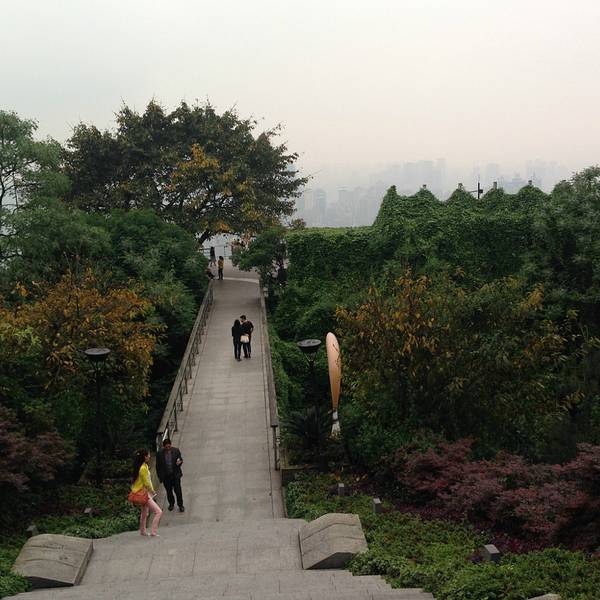 等待落日那一段是漫长的,因为一棵树景区里没什么好玩的。如果天气冷,不妨去南边那个柱形的建筑。六楼是玻璃室内观景台,里面有两个沙发休息下。再上一层(爬楼梯)是露天观景台。第一次到重庆的人,一定不能错过这“小香港”般的夜景。资深的摄影爱好者可以去寻找穿梭中的三块石,反正我们没有去。