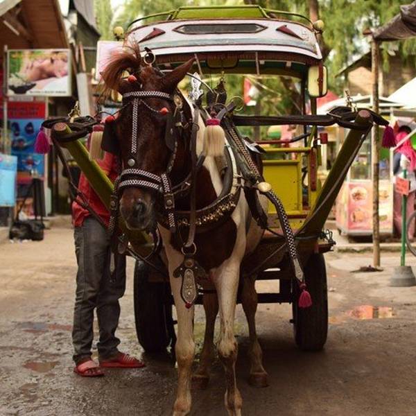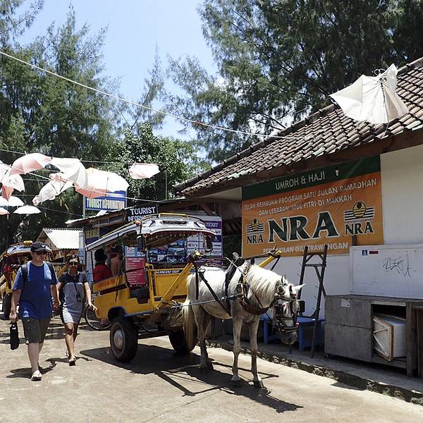 金骆驼 岛上的特点是有个小湖,不知道为什么木栈道只修到一半,风光还是不错的从龙目岛机场到码头要2个小时,还要坐船才能到这三个吉利群岛上,公共码头发往Gili Trawangan的船次比较多,买好公共船票就在室内候船,有房顶的大喇叭提示下一班船去哪里,工作人员也会提醒。票价为Rp15000,时...从龙目岛机场到码头要2个小时,还要坐船才能到这三个吉利群岛上,公共码头发往Gili Trawangan的船次比较多,买好公共船票就在室内候船,有房顶的大喇叭提示下一班船去哪里,工作人员也会提醒。票价为Rp15000,时间为30分钟左右。我主要去潜水,三个岛各住两晚,到Trawangan的码头就去看开往Gili Meno的班次,上下午各一班,问过工作人员说随到随买,于是记下时间就去愉快地玩耍了。吉利三个小岛都没有任何机动车,交通主要靠马车,自行车和步行,每个岛都不大,所以去任何地方都很方便,建议选择离码头近的酒店入住,不然行李多的话只能叫马车,马车的要价不低哦。