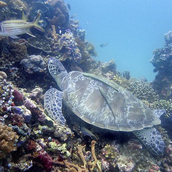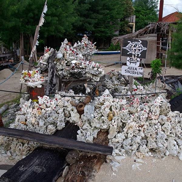 Gili Trawangan是吉利三岛上面积比较大的,租了自行车,环岛一周,拍拍照,喝喝饮料,用了半天的时间,自行车有两种,一种普通轮胎的,一种沙地用的宽轮胎,租普通的就好,在小岛北面有大片沙地,不管什么轮子的自行车都只能推。自行车租借费以24小时计,建议到码头就租辆带车兜和书包架的,放上行李找住处,轻松很多。Gili Trawangan是三个岛里娱乐项目最多的,除了有很多潜店,可以学自由潜水、参加跳岛游,还可以海钓、玩站力冲浪板、皮划艇、平衡舟等等,西边还有海上秋千、骑马、瑜伽班。东面的主街上有各种美食,价格越往北越便宜,有学做印尼菜的厨房,有spa,还有个比较大的小海龟保育中心。但住在这个岛上有个很恼人的问题:凌晨4点清真寺的大喇叭会念祷文很久,硬生生被吵醒。