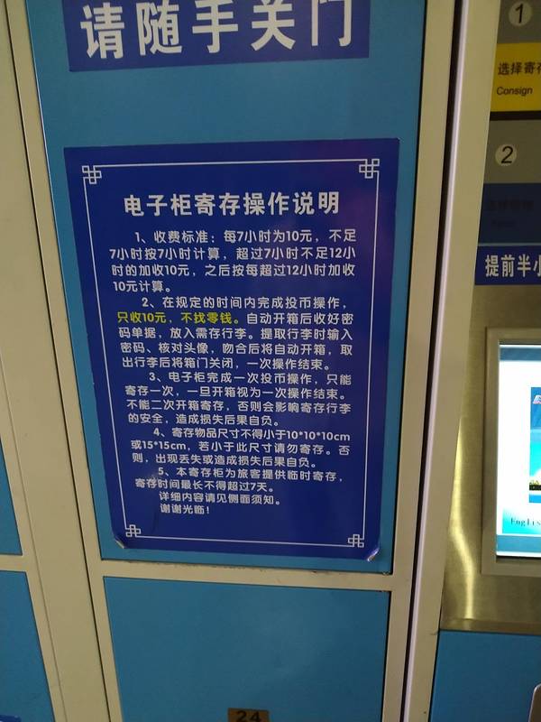只能拍拍这里的设施,最吸引我的是这里的寄存的柜子。南京南站出发大厅有很多寄存的柜子,出行有需要的可以了解下这里是收费标准,价格还是很划算的。这里适合在南京中转时间比较长,将行李寄存,再去南京市内其他地方转转的朋友。