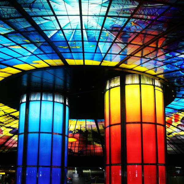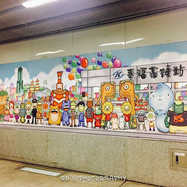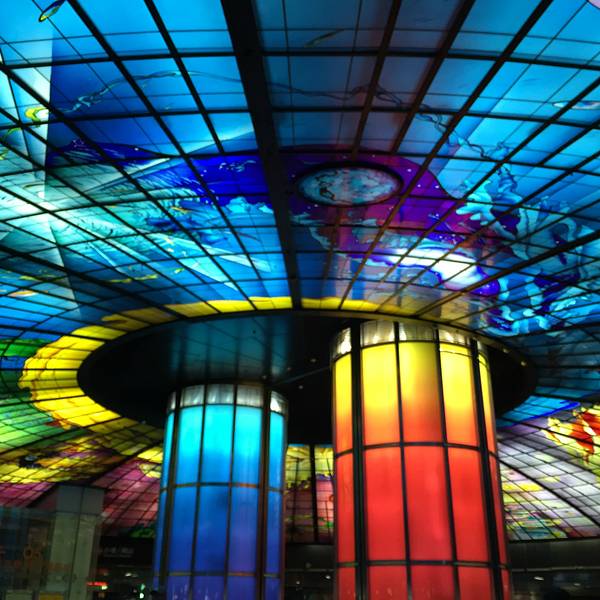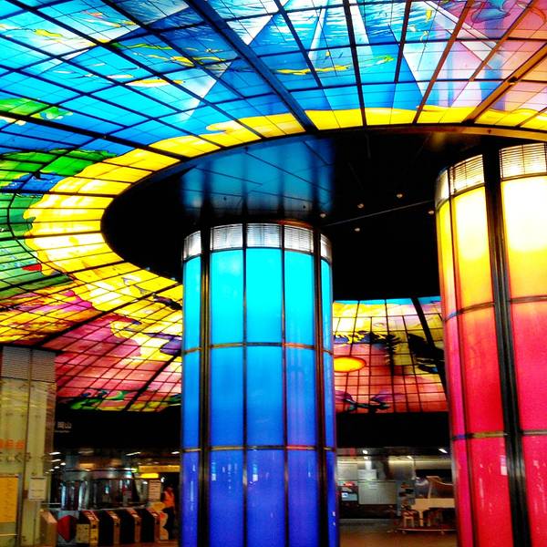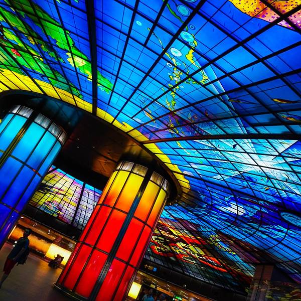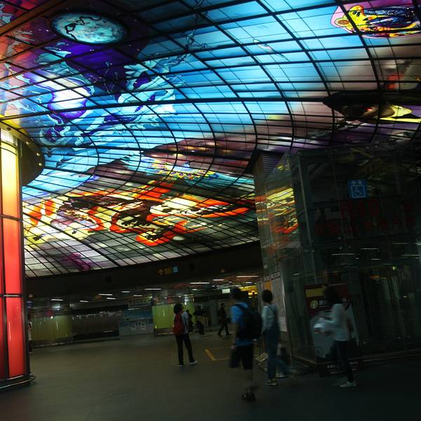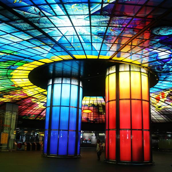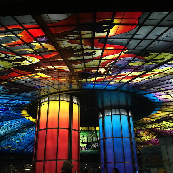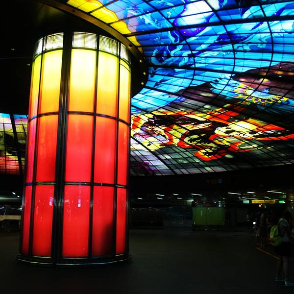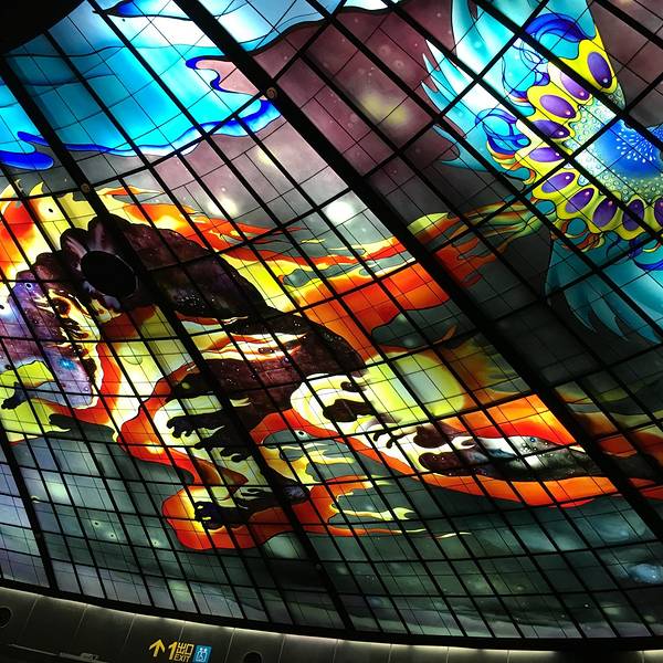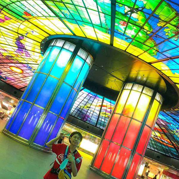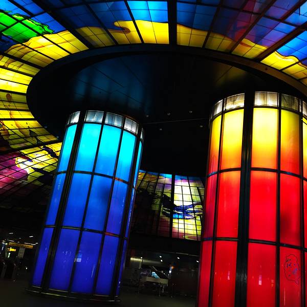 直径30米、面积660平方米,被评为世界第二美地铁站,本站共有11个出口,11号出口能直达六合夜市。车站中心是个圆形大厅,用四千五百片彩色玻璃制作成世界最大的玻璃艺术品。玻璃上印着彩色图案,不同方向有不同的故事,有海洋,宇宙,生物,美轮美奂真心值得来看一看。