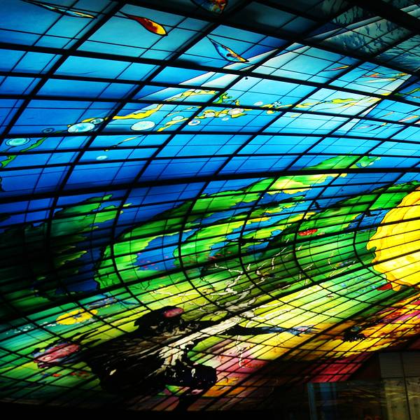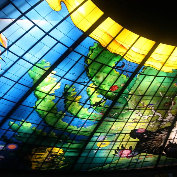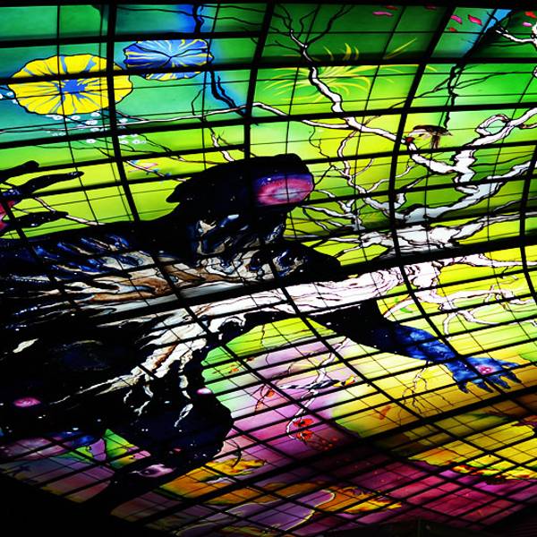- 车站中心是个圆形大厅,用四千五百片彩色玻璃制作成世界最大的玻璃艺术品。绿色覆盖的地区,还有绿树实用