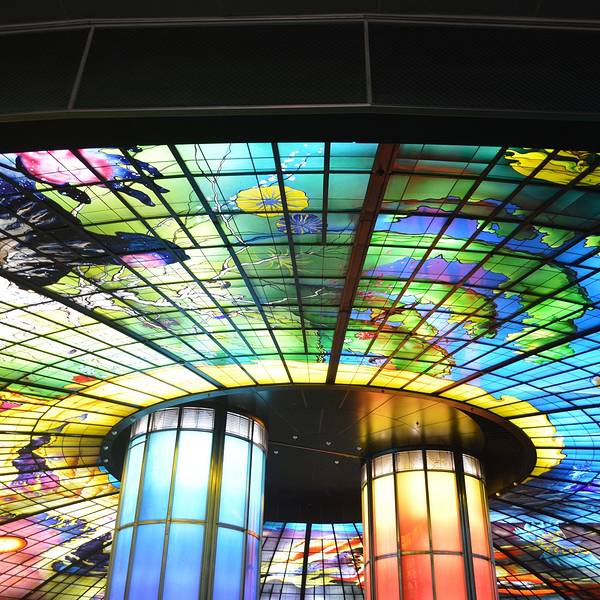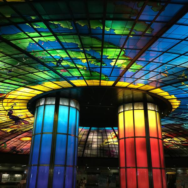 位于高雄的美丽岛捷运站,是以著名的美丽岛事件而命名。这里也是世界最美的地铁站之一,最为有名的就是这座如艺术品一般照耀在车站上空的光之穹顶,由意大利艺术家水仙大师亲手打造,车站的顶部完全由彩绘玻璃拼接镶嵌而成,五彩斑斓美轮美奂的穹顶一定会惊艳到你。很多台湾的电影都在此取经,真的非常美丽。穹顶上由各种各样的画组成,每一幅画都有此深刻的象征意义,将中国传统的阴阳五行和现代艺术结合。