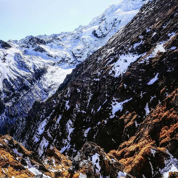 由于距离之近,看缅茨姆峰的视觉变形...攀到山头的顶端,时间已经超过了三点。那样独特角度的缅茨姆,果真现身。山头风大,我脚步难以站稳,更不敢移动。再向前一步就是悬崖,我只好坐在雪坡上欣赏神女,不敢站立。