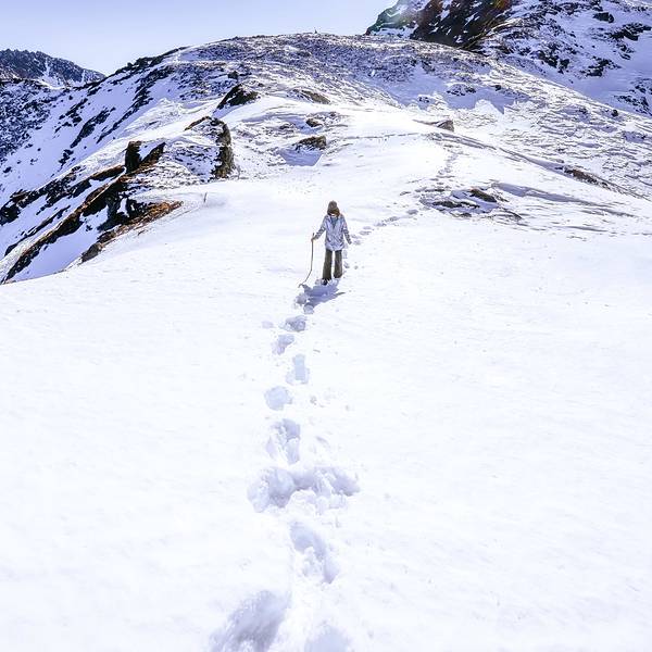 攀到山头的顶端,时间已经超过了三点。那样独特角度的缅茨姆,果真现身。山头风大,我脚步难以站稳,更不敢移动。再向前一步就是悬崖,我只好坐在雪坡上欣赏神女,不敢站立。 由于距离之近,看缅茨姆峰的视觉变形更大,线条优美的山尖部分像是成了一个极小的锥子,而冰川密布的山体却宽阔得不能被一眼容纳。相比其他的转山,梅里内转实在是个略显寻常的地方。可寻常地方也有不寻常走法,我庆幸自己这次过神湖之后的继续冒险,令我发现这不能在网络上看见的缅茨姆峰的独特视角。我忽然听到小蛮叫我的名字,我高声回应了她,猜想她等得焦急,赶紧下山。 当看到小蛮时,她正踏雪上山。 我走到她跟前,满心欢喜,想要向她分享看见神女峰的喜悦,却看她神色似乎闷闷不乐。 我低头,视线掠过她的鸭舌帽帽檐,看她那双灵动的眼睛似乎有些泛红。 她颤着声音说:“我喊你你也不答应。叫了好几声小简,你不答应,我又改口叫你姓名。好怕你遇到危险。虽然后来听到了你的回应,心里已经不再担了。可真看到了你,又忍不住难过。你以后不准丢下我一个人去冒险了。” 她的声音颤抖,最后几个字成了浅浅的抽泣。 巨大的愧疚袭击了我,我心疼不已,一时也慌乱无措。我伸手抹去她眼角流出的泪珠,口中念叨着:“不会了,以后不会了。你看,我这不好好的下来了,没发生什么事么?”下山的小蛮