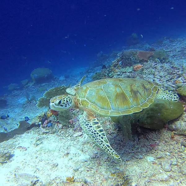 下午雨是彻底停了,他们还在睡觉。我赶在3点就来到潜店。潜导Tom人很热情,对我带来的脚蹼很感兴趣,试了又试,觉得质量不错。同行的还有两位女士,他们的行程是为了明天去诗巴丹。都交代清楚了注意事项,试穿了装备。我们就沿着潜店门口的缆绳摸索着下潜了,我还是第一次岸潜。又回到深海的感觉还是很奇妙的,这一别就是三年啊,激动的溢于言表,但为了节省氧气,尽量放缓节奏,好在海底流比较大,推着我们飘着前进,很轻松。这算是大风天的好处吧。"叮叮叮叮“这是潜水最喜欢听的声音,Tom的叮叮棒,第一个小惊喜就是一条大大的拿破仑,再然后就是自由自在的海龟。整条线路就是顺着洋流围绕着马达京本岛的边缘探索。”叮叮叮“,先看Tom手势,是一条魔鬼鱼,然后就是原地团团转的寻找,就看到隐约中一条远去的黑影。海龟真是很多。出水之前还是巨大的礁石下的缝隙里,发现一只正在睡觉的海龟,真挺聪明的,把自己卡在下面,安全又省力。出水后,潜水船已经在等我们。返回岛上已经是下午五点多了。其他人都在拖尾沙滩打卡秋千,潮水涨的厉害,已经把秋千的座位淹没。风浪依然很大惊涛拍岸的场面。只有延申到远处的沙滩才会有些安全感。