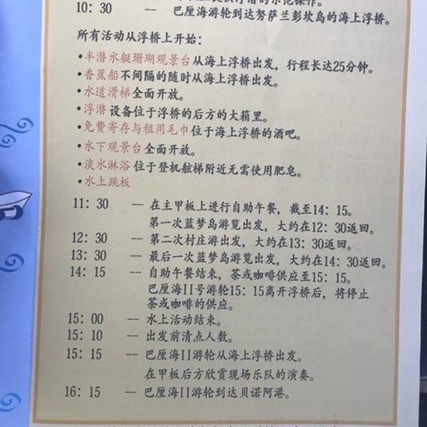 4、如果你是跟随团队的船去蓝梦岛游览,请一定要注意时间,因为时间是船从浮桥出发,到船回来到浮桥总共只有一个小时。所以一定跟着团队走,千万不要单独行事,不然会赶不上回浮桥的船。