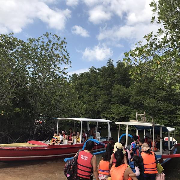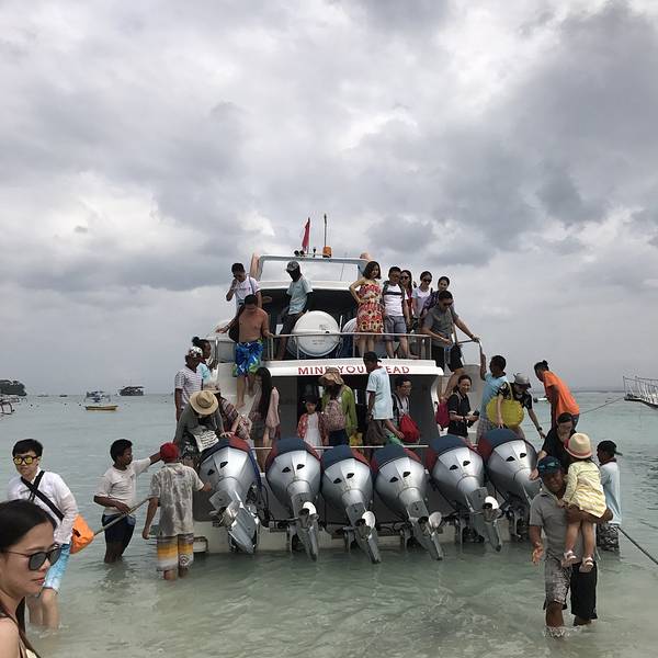 金骆驼 在岛上闲逛。最后强烈推荐岛上的一家饭店,叫mamamia。菜都特别好吃,味道很棒蓝梦岛从啥努尔坐快船其实半小时就可以到,码头很拥挤,是很多家的代理商,一般都提供酒店的接送服务,但还是要问好,不要被骗,我们当时是找库塔的包车司机定的票,他和我们说不接去码头要我们做他的车,十分钟...蓝梦岛从啥努尔坐快船其实半小时就可以到,码头很拥挤,是很多家的代理商,一般都提供酒店的接送服务,但还是要问好,不要被骗,我们当时是找库塔的包车司机定的票,他和我们说不接去码头要我们做他的车,十分钟要收150人民币,后来我们自己找了司机,六个人花了50元去码头。到了码头会有车送你到预定的酒店就是这种改装小货车咯这是在码头登船,我以为会想泰国普吉岛一样,去皮皮岛什么的船开开就越来越美了,然而并没有,尤其是刚上岛那个荒凉我还好只定了一晚住宿,本来准备住两晚的,还好只定了一晚。不过酒店还算不错,有个泳池可以挥霍。然后就在这里玩了很久的水。后来和店家租了一辆摩托车逛逛岛,好像有一个深潜的训练基地,也遇到很多朋友都是为了深潜才来蓝梦岛的。蓝梦岛消费不算便宜,尤其是上岸那边的娱乐项目,那叫个贵。后来来到了一个黄色的桥这边,据说是廉价两个岛的桥,然后我竟然天才般的找了一个船夫包船,带我们去两个岛浮潜(岛上有三个浮潜点,环绕在蓝梦岛周围),还去看红树林,才要250块,真的特别超值。早上七点我们就出发了。船夫就在这个桥下面找的,不怎么会英语,但是特别朴实进入红树林附近了,我们潜了两个点,其实每个浮潜的点附近应该都有海地漫步的项目,我们有看到那种游乐园一样的大船,但强烈推荐红树林这个点,鱼儿太多太美了,根本不想起来,船夫会给我们面包让我们去吸引鱼儿。这边水流也不会很急,另外一个点水流很急,水底还有个寺庙,说是人们把佛像丢进去的,但水流很急,鱼也不多,我觉得也很危险,不推荐。这个点看了,其他应该就没有欲望了。然后红树林挺近,渔夫的船进不去,要换小船带进去,我在海南去过红树林,觉得差不多,我们逛了下门口就出来了。