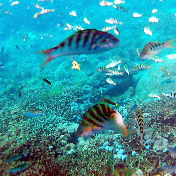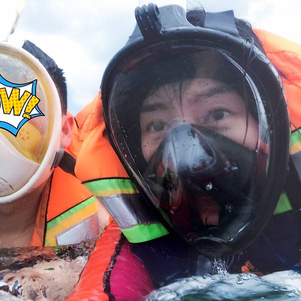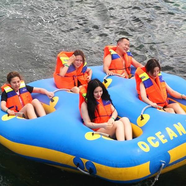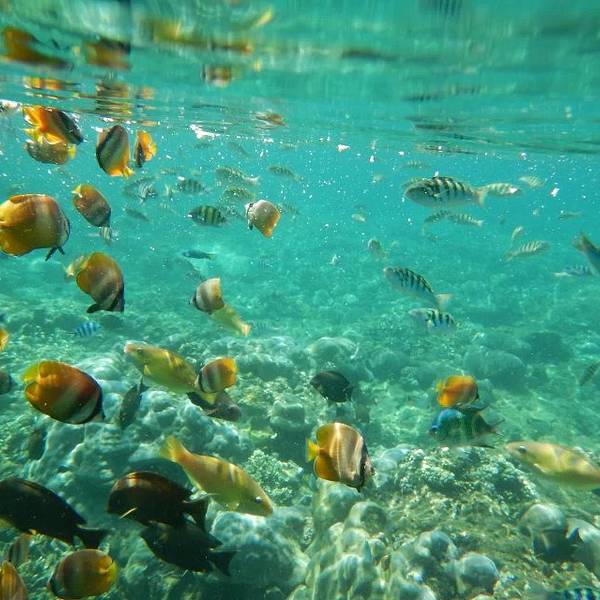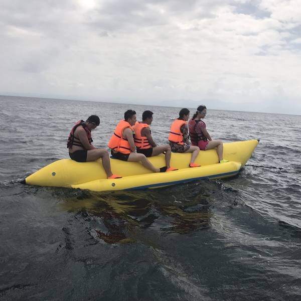 到了蓝梦岛会根据每个人参加的项目不同分头行动。差不多40分钟船程,抵达蓝梦岛码头。从码头下来,会有专门的双杠车等候,8人一车,先去一个专门的地方换衣服(泳衣或者浮潜服)、领浮潜装备。分头坐车出发,先游红树林。很快船开到海上,戴上浮潜装备,准备下水浮潜。淘宝提前买的浮潜服,有些爱美的妹子穿的泳衣,但是为了防晒,我还是推荐大家穿浮潜服吧,反正我没有被晒很黑,幸好没穿泳衣👙!我的手机渣像素拍的海底,后面有很多鱼的地方没有拍到。赠送的香蕉船项目,船司机把香蕉船拉到海上,然后猛地一回头,故意让香蕉船翻船,所有人都翻到海里,蛮刺激的。