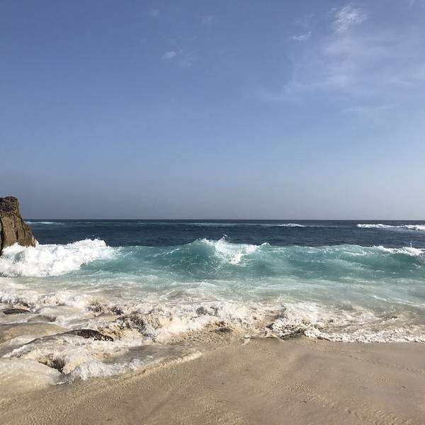 在岸边拍照都随时可以感受到身后的巨浪拍出的水花,浪声也超大,而且随时可以看到阳光通过水气折射出的美丽彩虹🌈第二美就是梦幻白沙滩,海水也是超级蓝,浪也超大!一个浪拍过来,准备拍照的老公裤子打湿完了。美好的时光总是短暂的😌