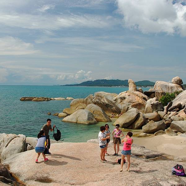 拉迈海滩的沙质比较细腻,你可以与心爱的人一起潜水、划独木舟,更或者一起驾帆出海,享受海天一色的美妙景观。当然,你也可以在海滩上随意地铺个浴巾晒晒太阳,拍拍照片。享受整个下午时光,看暖暖海风吹过椰子树,看海浪卷了细细的白沙翻上岸边,又从光滑的沙滩褪下。 信他和信亚,祖父祖母石 另外,值得一提的是,拉迈海滩比较有名的景观就是“信他和信亚,祖父祖母石”,它们位于拉迈海滩的南部,主路边上的一条小路中,沿4169号公路向拉迈西南方向走。 祖父石直直矗立在岩石上,祖母石则远在百多米之外,隐没在波涛汹涌的大海中,只有在退潮时方可清楚的看见。这两块石头是摄影爱好者来苏梅岛必去拍摄的景观之一。 由于周围散布着众多的大石头,这里也是喜欢晒日光浴游客经常来的地方,摸上一点椰子油,静静的躺在那里和阳光亲密接触。通往信他和信亚,祖父祖母石的小路也是一条购物街,这里的椰子产品值得购买,如椰子软糖和椰子壳制品等。如果时间充裕的话一定要去看一下。 此外,拉迈海滩还会定期举办沙滩节,岛上的各个大酒店派出员工搞的一场化妆舞会,还有各种表演。