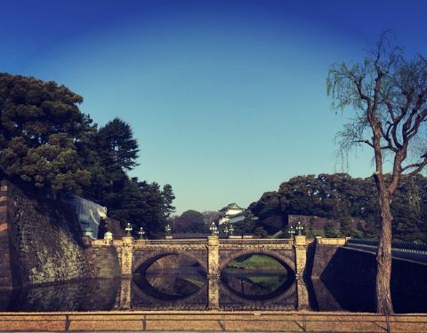 二重桥位于皇居正门前,横跨内护城河,是公认的日本标志。二重桥是通向皇宫的特别通道,有皇宫护卫官仪仗队在把守,除非事前有过申请参观皇居,或是皇居开放参贺的日子,其他时候民众无法通行。 二重桥无疑是东京都内很好的拍照地点之一,在这里可以同充满江户遗风的皇居合影留念。 从皇居前方的广场望向宫殿方向,可以看见石造的“正门石桥”与后面铁造的“正门铁桥”两座桥,但“二重桥”其实是指后方正门铁桥,因护城河水深,旧桥较低,所以在桥上又搭了一座桥,称为二重桥(前方的正门石桥也被称为“眼镜桥”)。 二重桥下的护城河被认为是皇居很美的地方,倒映着垂柳和二重桥,水面十分平静,桥洞下长满了苔藓,更是增添了一丝历史感和宁静感。