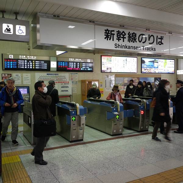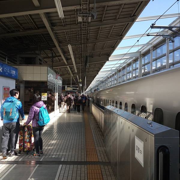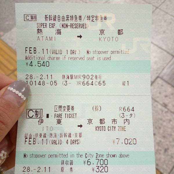 伊东没有新干线,因此,我们要赶到热海乘坐新干线。我们上午乘坐9:31分的“JR线”(类似于城际铁路)到达热海,从热海再买新干线的车票到京都。整个换乘时间大约有30分钟,时间相对比较紧张,好在都比较顺利,人工购票也比较方便。从热海到京都有很多种车次,这就意味着你可以选择时间短和时间长的车程,价格也就有相应的差异。我们选择了最快的新干线,当然票价也是最贵的,一个人的车票要600多人民币。在同一趟车当中还会分自由席和指定席,道理不言而喻,自由席不一定有座位,指定席肯定有你所购买的座位,当然自由席的价格也相应便宜。我们每个人的车票所花费的600多是自由席,指定席的话会更贵的。