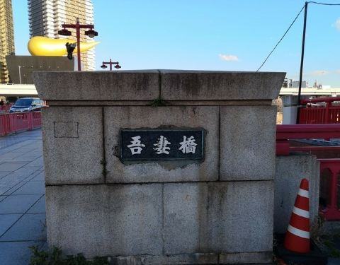 吾妻桥于1774年架立于隅田河,原名“大川桥”于1875年改名为“吾嬬桥”。在大川桥时代开始往吾嬬神社参拜的信徒们称其为“吾妻桥”。在桥上可以看到旖旎的江景,各种建筑掩映在浅花繁树之间,是东京特有的城市景象。