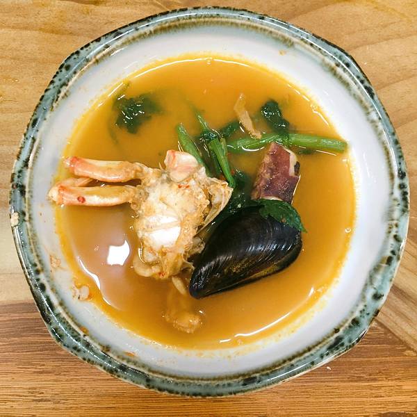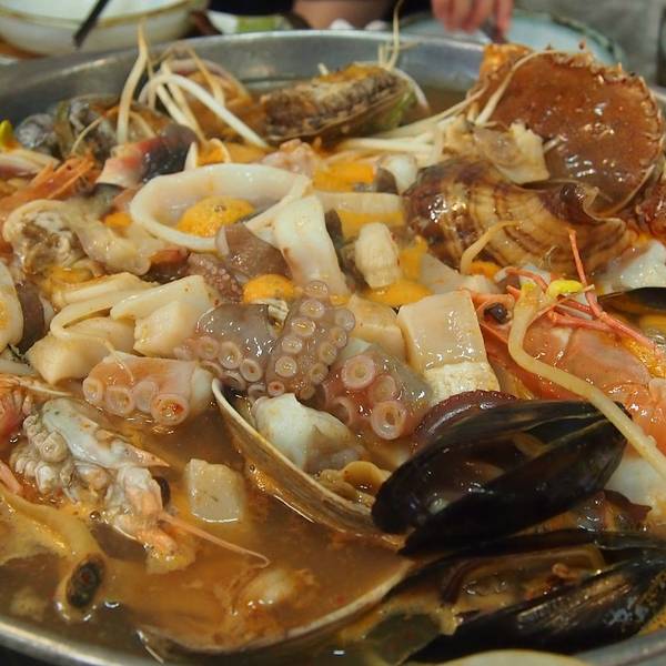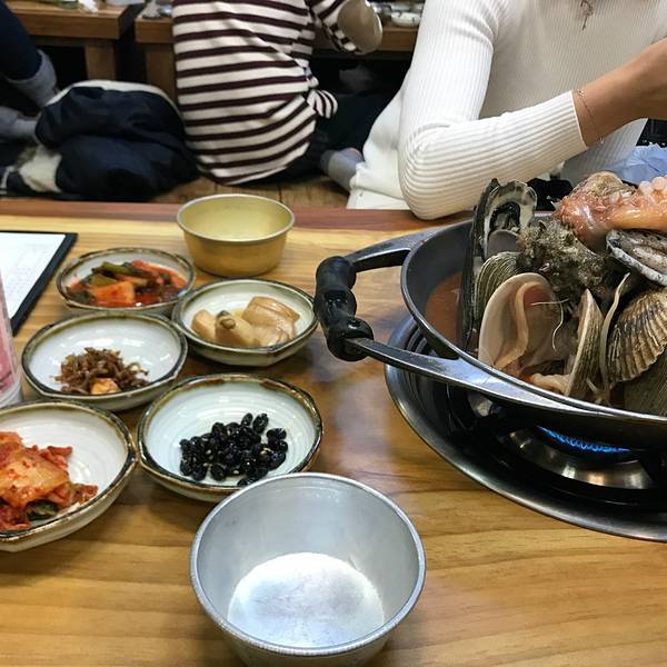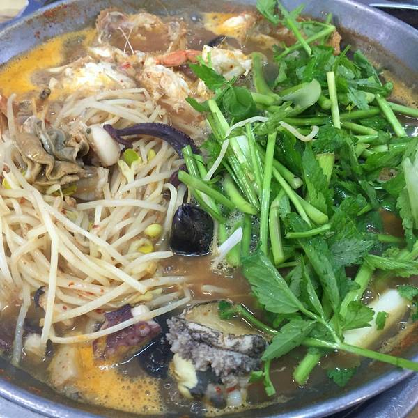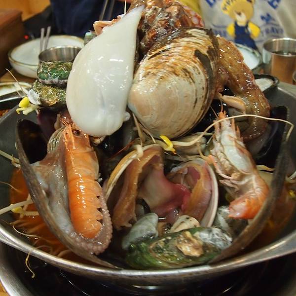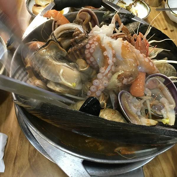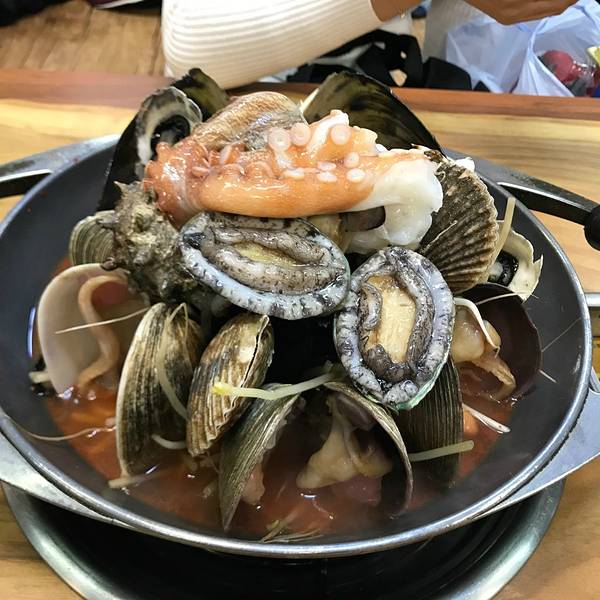 大雨天的店内依旧人头攒动,一半以上都有当地 韩国 人入座。看着隔壁一大盆的海鲜杂烩,食欲顿时勾起,两人点了2-3人份的海鲜锅,鲍鱼粥,总合计560元,人均230元。非常好吃!