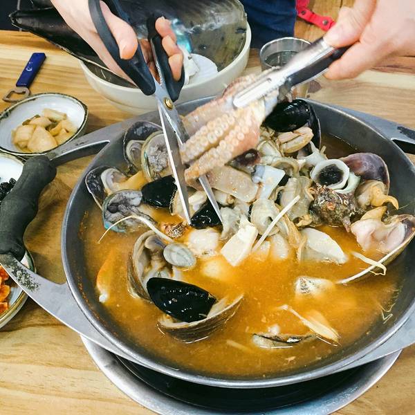 因为一张海鲜锅的照片,吃货的精神,就算暴走几条街,也要找到它。 三姓穴的海鲜锅,原汁原味又营养的料理。 这里绝对对得起海鲜锅这3个字,所有的食材都是鲜活的。 感觉韩国料理最好用的工具就是剪刀,咔嚓几...