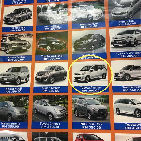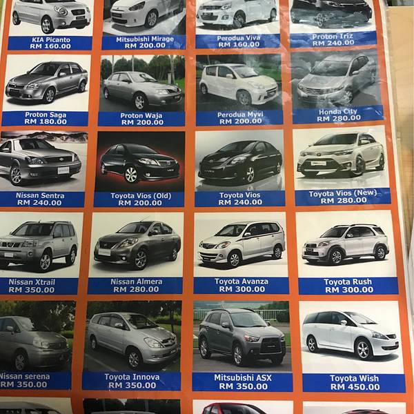 品牌多数以他们的本地车Porton,还有日产、丰田为主。价格在160RM~400RM之间。