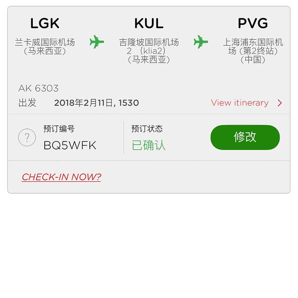 13:30,安全抵达机场,wechat联系车商,直接在departure碰面退换押金50rm就ok啦!还有1个多油没有用完,其实就按攻略上按每天10rm的量加油就够了,我们听了商家的加了40rm,很任性的开都没用完😂 一直在想50rm押金也不押护照、驾照算个啥?一辆车总归不止50吧,不过可能这就是信用!不知道大马的法律规定不还会怎样计划航班: 乘坐亚航AK6303 -D7730 转机吉隆坡抵达上海浦东15:30-00:50,共计8h20m 2-10下午13:30,提前2小时就到达机场,可尴尬的是居然遇到了此次行程的第一次航班晚点……但愿不会影响下一航班的飞行~~3:40登机,4:14终于起飞,延误44分钟。 God bless us~~