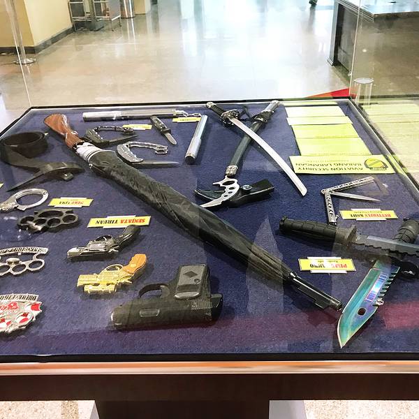 ...个展览枱,这是警察提示乘客不能𢹂带相关的武器,其中最吸引我的是一把雨🌂枪,真像电影中的道具