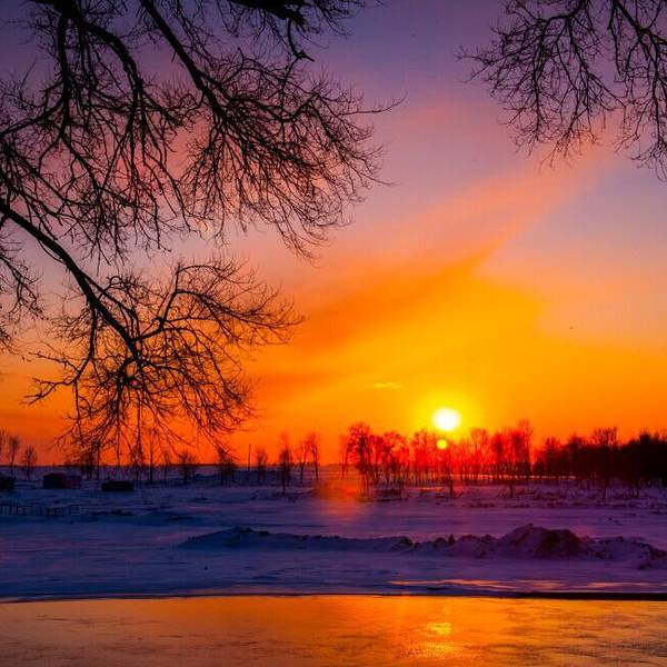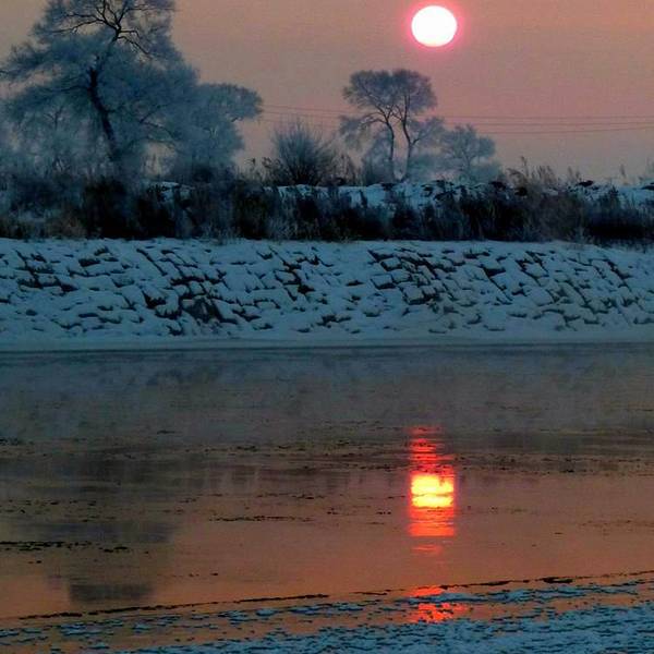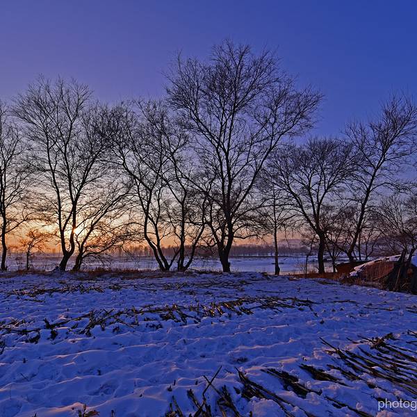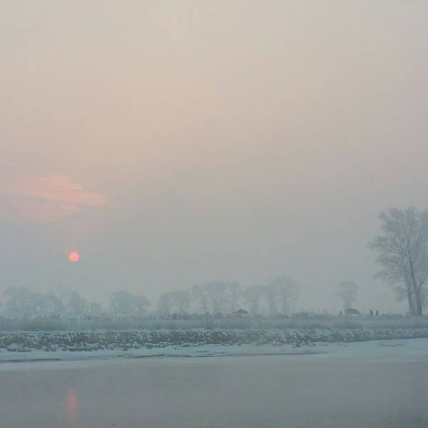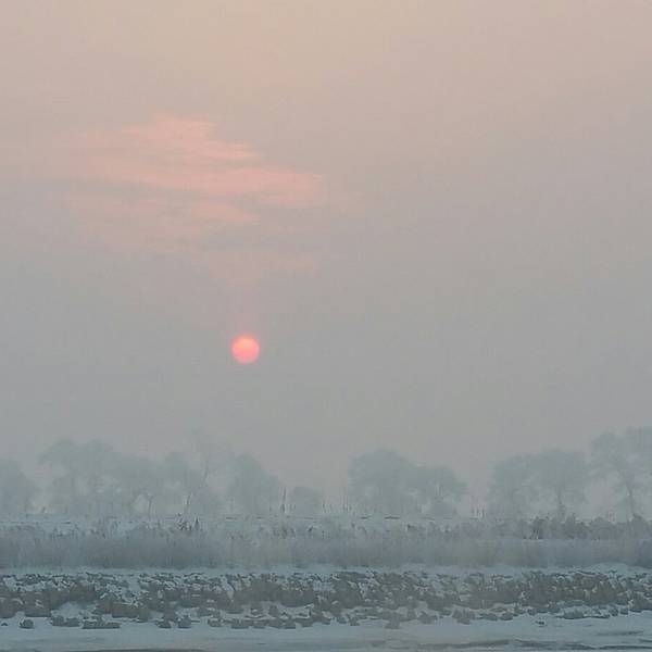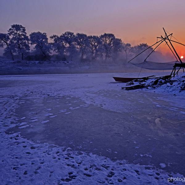 日落时分,江边游客很少了,景色唯美!第二天凌晨起来,买票渡船到岛上去欣赏日出。从韩屯和曾通两个地方都可以上岛,韩屯人气旺更旺些,60元就是坐个摆渡船来回。需要注意的是,雾凇因为风向的关系不一定出现在何处,有时岛上没有树挂,而韩屯河岸边很漂亮。岛上是欣赏日出最佳位置,所以喜欢看日出或者摄影的朋友还是建议去岛上。