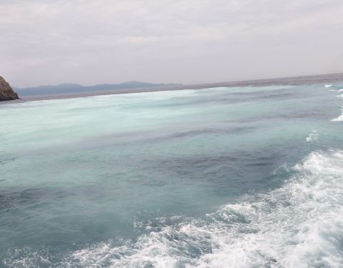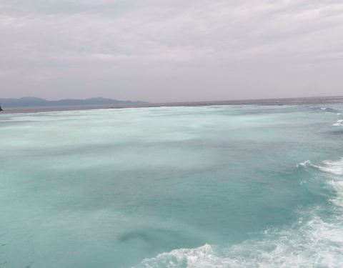 到了海底涌泉的位置,每前进一段距离海水的颜色都会有所变化🔍海底出磺口附近是一处海底涌泉,图中的阴阳海,就是海底涌泉❣️❣️❣️在船上看到海底涌泉处居然有人在这里游泳~~amazing~😱硫磺味阵阵扑鼻而来,龟首经年不断冒出琉磺气,第一次看到这样的奇观表示十分震惊!