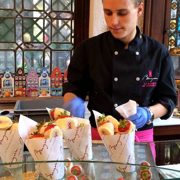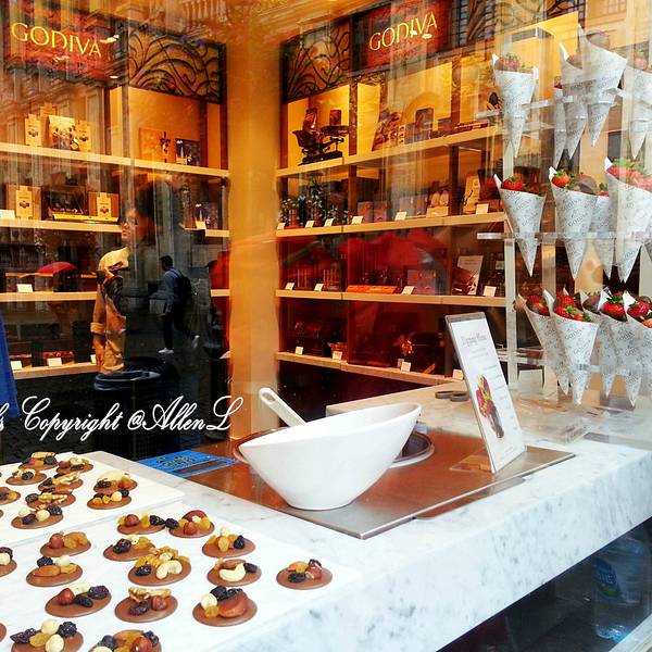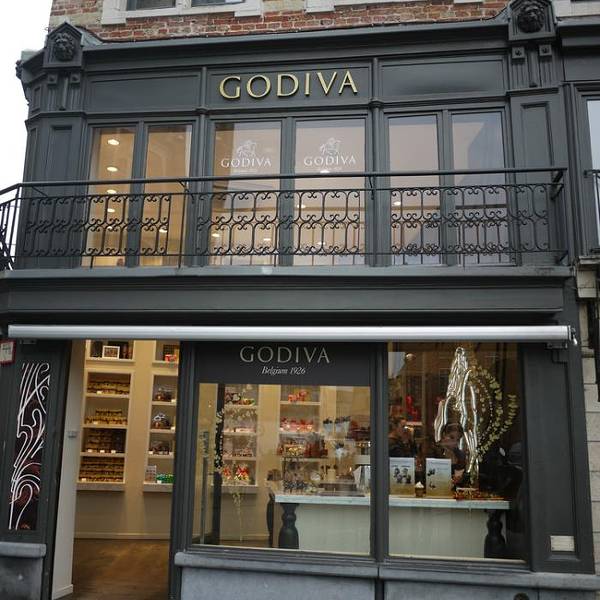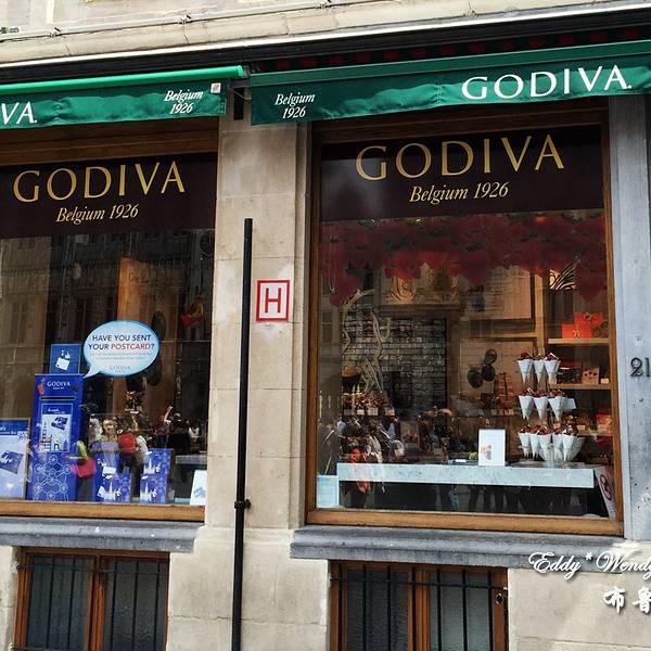 比利时人Joseph Draps 于1926 年在布鲁塞尔创办了自己的巧克力店,并以Godiva 命名。传说在1057 年,考文垂市的Leofric the Dane 伯爵向市民征重税。他的妻子Godiva 夫人恳求丈夫考虑民间疾苦,并与丈夫打赌,如果自己赤裸身体骑马穿过大街,市民都关窗不视,便可以减税。最终,Godiva 夫人赢得全城百姓的敬重,而伯爵也遵守诺言减免税收。巧克力也用Godiva 夫人的形象作为商标。在布鲁塞尔主要商业街区都能找到Godiva 专卖店,值得推荐的是一家工厂店,游客在此购买时需要注意生产日期,很多时候已经临近保质期限。不过价格确实要实惠很多,有时甚至能打到6 折。
