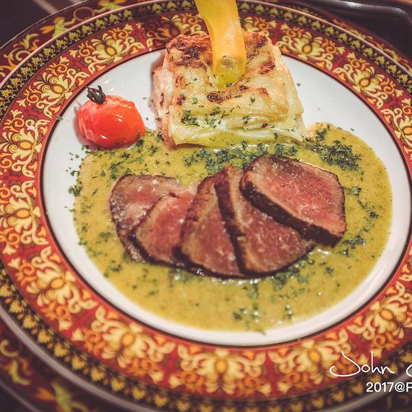 人均:400元人民币左右范思哲法餐厅,在芭 东北 面的小山坡上,跟着导航在大路上走,会看到一个小路牌,写着Le Versace,边上画着个箭头,从这个地方走上山坡就到了~先说环境,餐厅有两层,上面那层是露天景观。可以俯瞰芭东,是普吉绝美的落日观景点。到餐厅的时候5点刚过,时间尚早,经理带我们参观后提议在楼上喝一杯等日落。不过那天下雨,我估摸着看不到日落,露台湿漉漉的,就下楼了。所有的餐具都是老板一件件海运到 普吉岛 的。葡萄酒很不错,价格也很合理,推荐你们点了试试。点了chef menu,前菜是生牛肉 塔塔 、小饼干、玉米浓汤。第二道上的的是煎鹅肝配奶白汁蝴蝶意面,外酥里嫩,一整块下肚还是略腻,两人分享就刚刚好啦~香槟汁煎大虾,海鲜产地出品,自然是新鲜弹牙。主菜是和牛,一开始还以为边上的配菜是焗酥皮,略不喜欢。挖了一口,原来是焗土豆,超好吃!和牛煎的恰到好处,搭配的酱汁也十分美味。另外多点了一份海鲈鱼,某人说鱼的品质不错,我一心一意和我的和牛谈恋爱,就没尝~主厨菜单上写着甜点是surprise,应该就是根据每天不同的出品变换,我们那天是柠檬挞配覆盆子冰淇淋和水果。