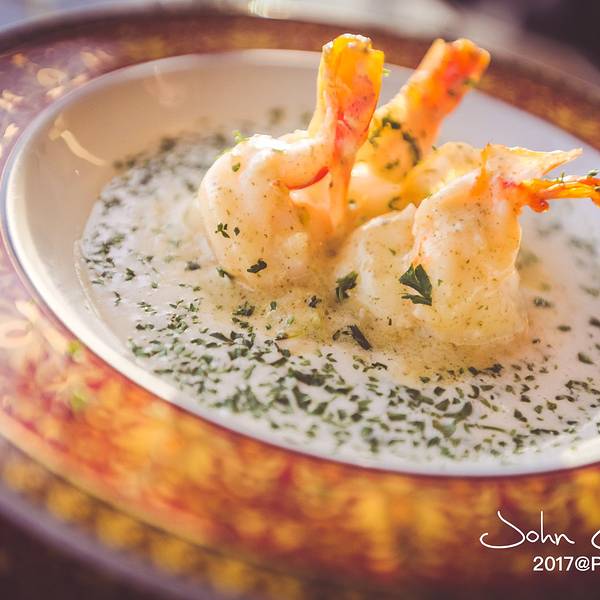 - 挖了一口,原来是焗土豆,超好吃!我很嗜酸,所以非常对胃口。香槟汁煎大虾,海鲜产地出品,自然是新鲜弹牙