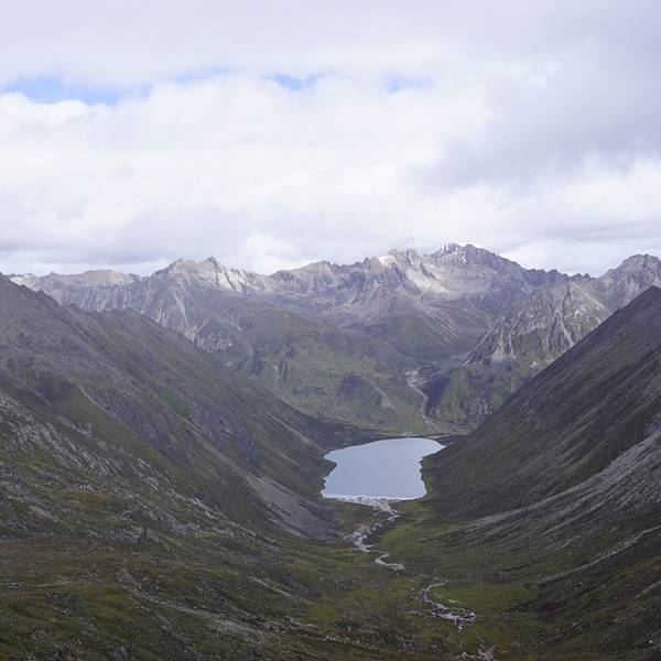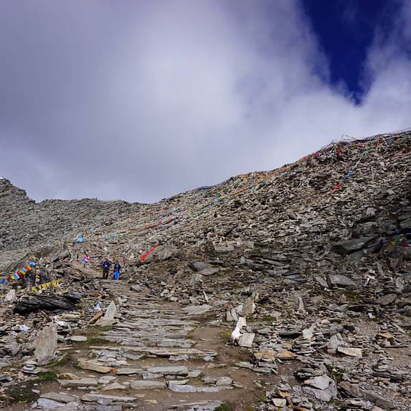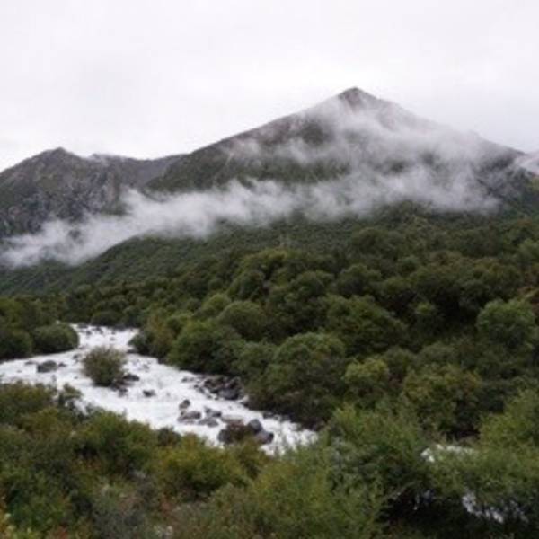 酒店隔壁有一家小吃店,包子油条稀饭早餐过后,我们出发前往位于加查县城东北部的神湖拉姆拉措,据说有缘的人看到她就可以看到自己的前生和来世,神湖深居在海拔5080米的山上,今天可以称为有生以来的海拔高度挑战了。沿途风景照旧是美不胜收,多云的天空,大白行驶在云里雾里的盘山公路中,这里颇似九寨黄龙的美,沿途会时时停下留影。潺潺溪流,袅袅炊烟,当然还有随着海拔的升高,我们深深的喘息,不时有野牦牛成群结队的在山坡上游走。 汽车到达山前的停车场,我们一行5人开始徒步向5000米以上的高度攀登,这绝对是我长这么大以来最具有纪念意义的人生海拔高度,也是我面临的最艰巨的体能和毅力的挑战,我从来没有这么清楚地感受到我的心脏是时刻跳动着的,因为她的速度之快好像是下一刻就会骤然停止!开始我还希望能一直跟随司机师傅的速度向上行进,但是注铅一样的腿已经不听使唤了,过了一会我发现师傅竟然已经返程了,他鼓励我们坚持走上去,也提醒我们天气开始有变化了,要注意安全。既然来了,一定要拜拜这神秘和神圣的湖(建议大家根据自己的身体状况决定)。终于我们4个人走到了那可望可及的高度,看拉姆拉措!