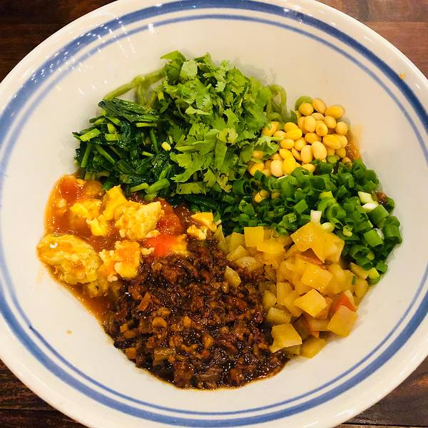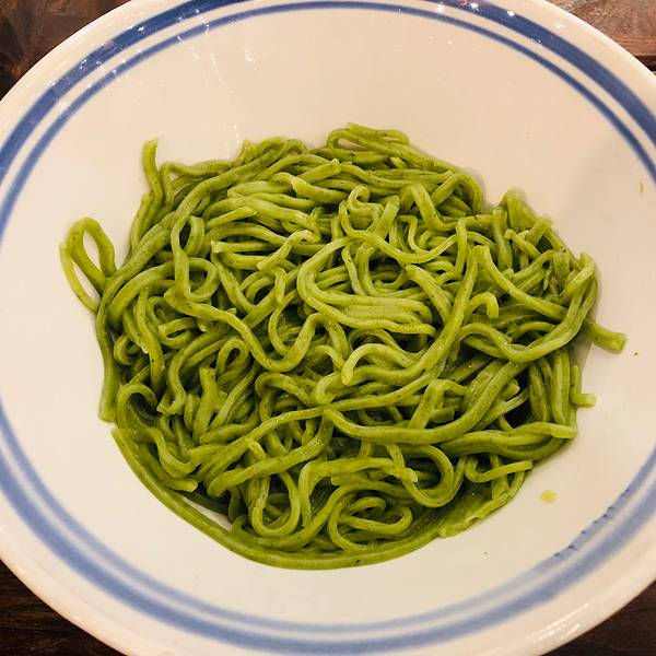 其实是看有团购来着,进去一看环境还挺古色古香的,生意很好,要排队,不过不少人都是一碗面搞定,所以也很快的,菜单价格很实惠哦!跟闺蜜一人一大碗菠菜面,这个颜色就很有食欲有木有~酱料是自己选的,有自助...