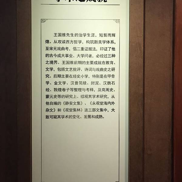 ...的小径缓缓踱步,四周绿植青翠,一座座小石墩若隐若现,定睛一瞧,这里还设有一口水井,让人眼前一亮有人说,王国维的学术成就像一颗耀目的钻石,每一个晶莹剔透的切面都闪烁着令人心旌摇曳的光彩。提起王国维,大家都耳熟能详,作为中国近现代享有国际声誉的著名学者,它的名字曾无数次出现在课堂中,让人记忆犹...有人说,王国维的学术成就像一颗耀目的钻石,每一个晶莹剔透的切面都闪烁着令人心旌摇曳的光彩。提起王国维,大家都耳熟能详,作为中国近现代享有国际声誉的著名学者,它的名字曾无数次出现在课堂中,让人记忆犹新,而他在《人间词话》中提到的三境界,更令人受益匪浅。未曾想,这位德高望重的人间才子,正生长于浙江海宁盐官。在盐官镇西门内的周家兜,坐落着一座古朴静谧的房屋,那便是王国维故居。初见故居,我便被其不施粉黛的雅致所吸引这座不足300平方的小屋,是由王国维的父亲王乃誉所建造,当时王国维年仅9岁,在此度过了一段快乐的青少年时光,之后外出求学,每年仍旧回来小住,王国维将其亲切的称作“西城小屋”。故居门口坐落着王国维石像,一旁绿植环绕,古朴静美。穿门而入,迎接我的是一座小小的庭院,故居共分为2进,1进为平屋,共有三开间,2进为楼房,之后还设有天井和厢房,错落有致,私密性较强。走进前厅,映入眼帘的是王国维半身铜像,头戴瓜皮帽、架着圆眼镜,神态自若,学者气质一览无遗。四周的墙壁诉说着王国维的生平家世和生平事迹,一幅幅生动的插画,将王国维先生的一生娓娓道来。移步来到展厅,这里陈列着王国维先生毕生的心血与荣耀,其中最令人瞩目的是他的“人生三境界”,将其对学术的追求诠释得淋漓尽致。陈列箱内摆放着王国维先生的手稿、拓片等作品,暗黄的射灯将气氛渲染得有些凝重,漫步其中,宛若走进了王国维的学术殿堂,让人不敢有一丝懈怠。不知不觉来到了王国维先生的卧室,床前放着王国维生前穿过的鞋子,一袭红被格外引人注目,除了一些生活必备用品,并没有多余的陈列,整体给人感觉比较清简,然而简约之中,却透露着一丝精致感,无论是雕工精美的橱柜,还是端庄典雅的梳洗台,都折射出王国维先生的生活品质,如同对学术的追求一般,做到简而不俗。这里还藏有一座小小的后花园,沿着鹅卵石铺就的小径缓缓踱步,四周绿植青翠,一座座小石墩若隐若现,定睛一瞧,这里还设有一口水井,让人眼前一亮。最让我惊喜的,是王国维先生的书房,作为一名学者,书房无疑是王国维先生的心头爱,相比于卧室,书房倒显得几分贵气,简陋的橱柜内摆放着王国维先生收藏的花瓶,做工精美,花卉图案栩栩如生,墙壁上挂着几幅水墨画,诗意十足。书桌上摆放着王国维生前的笔墨纸砚,书桌前有一扇门窗,窗外绿树葱葱,云卷云舒,颇有一番意境。 展开