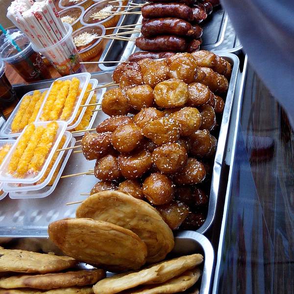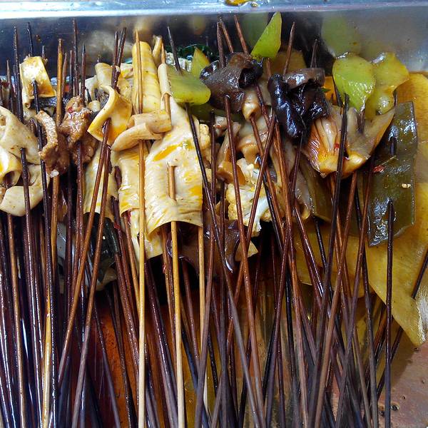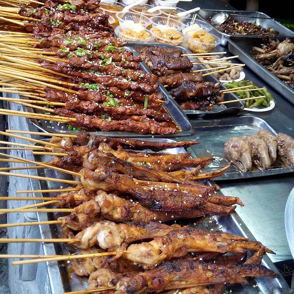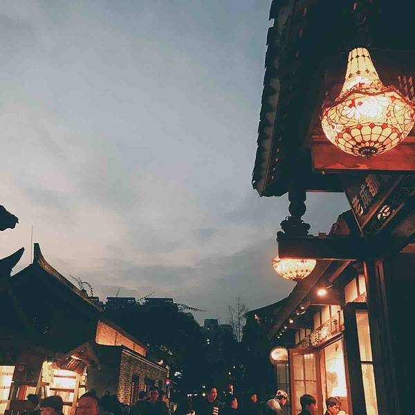 宽窄巷子其实是由三条并列的巷子组成,分别是宽巷子、窄巷子和井巷子,可能是为了方便好记,所以叫宽窄巷子。巷子里既有青砖黛瓦的古式建筑,也有独具风格的现代建筑,有那么一瞬间,让人有穿越的错觉。在当地有这么个说法,宽巷子,老成都的“闲生活”;窄巷子,老成都的“慢生活”;井巷子,成都人的“新生活”。但是我们一进去宽巷子就被路两旁的小吃给吸引住挪不动脚步了,烧烤、串串、兔头、凉面、凉粉、担担面,麻婆豆腐等各种特色小吃应接不睱,所以没有去细细品三条巷的不同之处,也可能是因为我们太俗,眼里只有吃的,看到沿途让人垂涎欲滴的小吃只要5-15元一份,哪还顾得了什么风景,吃了再说。凡夫俗子,说的就是我们这样的吧,吃货伤不起。在这里,你可以吃到一切代表成都味道的食物,比如串串、担担面、兔头等。当然,除了吃之外,巷子里有不少特色小工艺品店,或者装修风格很美的创意品店,有卖特色服饰的,也有茶馆,酒吧等。如果逛累了,可以找个茶馆休息了,听听音乐喝喝茶,整个世界的喧嚣似乎与你再也无关。